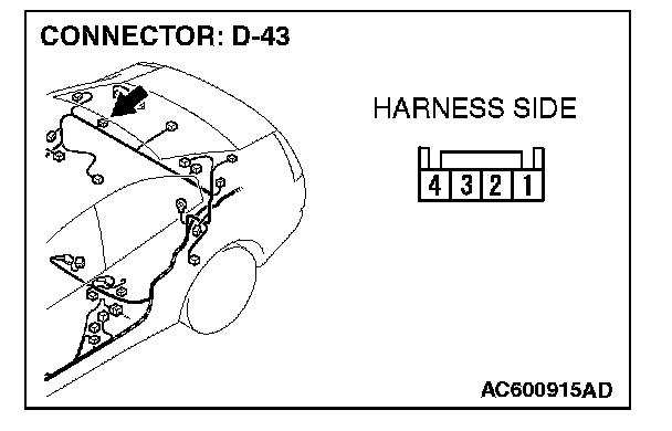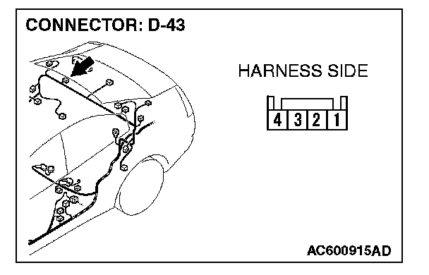 STEP 25. Check the wiring harness between rear speaker (RH) connector D-43 (terminals 1 and 4) and radio, CD player and CD changer connector C-111 (terminals 1 and 7).