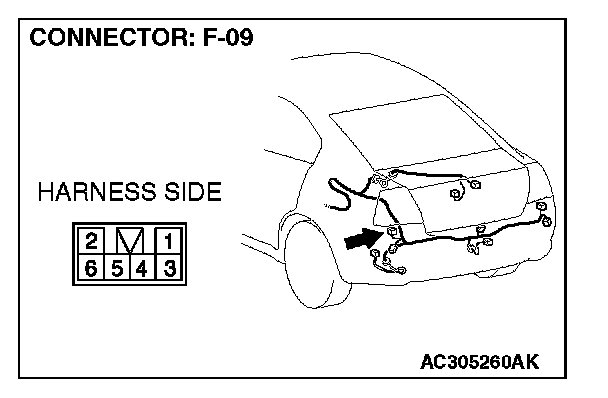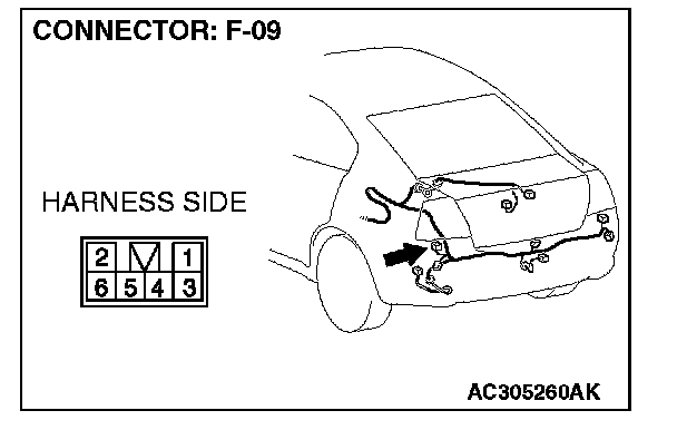 1. Disconnect rear combination light (LH) connector F-09 and measure the resistance available at the wiring harness side of the connector.
