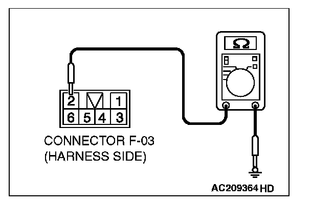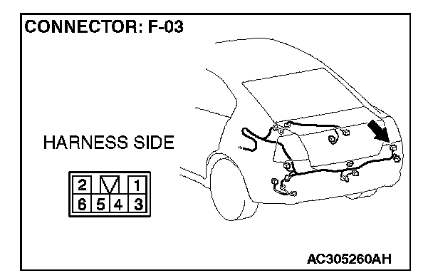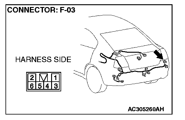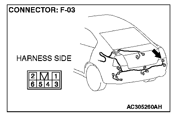 1. Disconnect rear light (RH) connector F-03 and measure the resistance available at the wiring harness side of the connector.