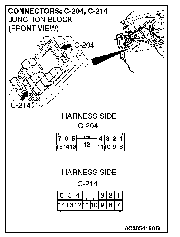 NOTE: Also check junction block connectors C-214 and C-204 for loose, corroded, or damaged terminals, or terminals pushed back in the connector. If junction block connector C-214 or C-204 is damaged, repair or replace the damaged component(s) as described in Harness Connector Inspection.