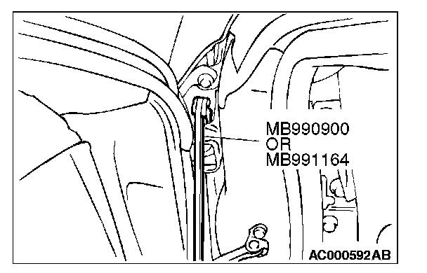 1. Use special tool MB990900 or MB991164 to loosen the hinge mounting bolts on the body side, and then adjust the clearance around the door so that it is uniform on all sides.