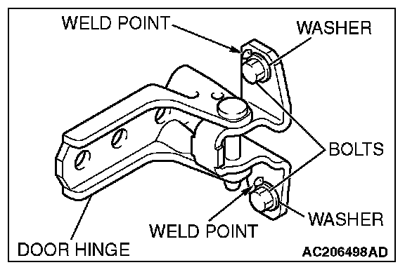 NOTE: If the door hinge mounting bolt washers are welded, grind off the welding according to the procedure below beforehand.