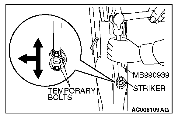 Install an temporary bolts instead of the striker mounting bolt, and use special tool MB990939 and a hammer to tap the bolt in the desired direction.