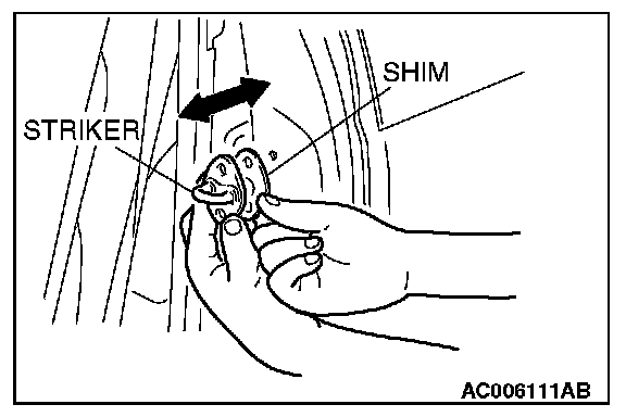 3. Adjustment by using shims (forward and rearward) Increase or decrease the number of shims so that the striker engages with the door latch properly.