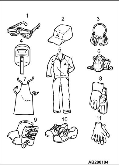 During body repair work, a work suit, a work cap, and safety shoes should be worn at all times. Depending on the work being done, safety glasses, gloves, ear protectors, a dust proof mask, etc., should also be worn as needed.