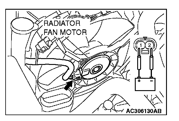 2. Check to see that the fan motor of the radiator turns when applying battery power between the connector terminals of the radiator fan motor. Also check to see that there is no abnormal sound coming from the radiator fan motor at this time.