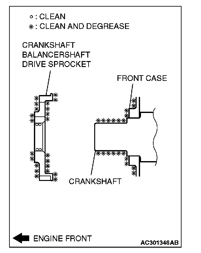 1. Clean or degrease the front case, the crankshaft and the crankshaft balancer shaft drive sprocket as shown.