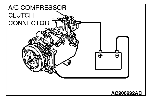 Connect the compressor connector terminal to the battery positive (+) terminal and ground the battery s negative (-) terminal to the compressor unit. At that time, the A/C compressor clutch should make a definite operating sound.