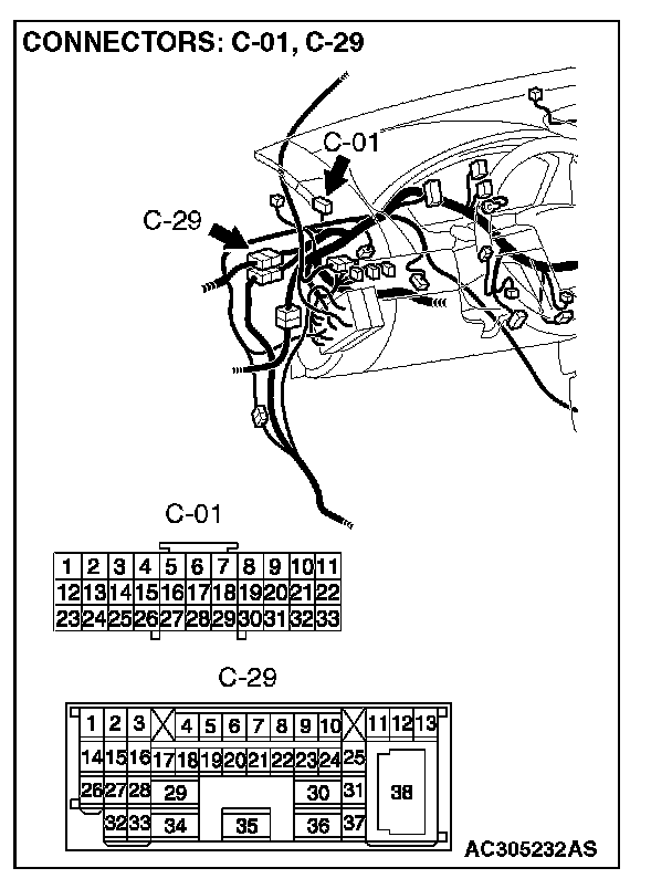 NOTE: Also check intermediate connector C-29 and joint connector 1. C-01 for loose, corroded, or damaged terminals, or terminals pushed back in the connector. If intermediate connector C-29 and joint connector 1. C-01 is damaged, repair or replace the wiring harness. Refer to Harness Connector Inspection.