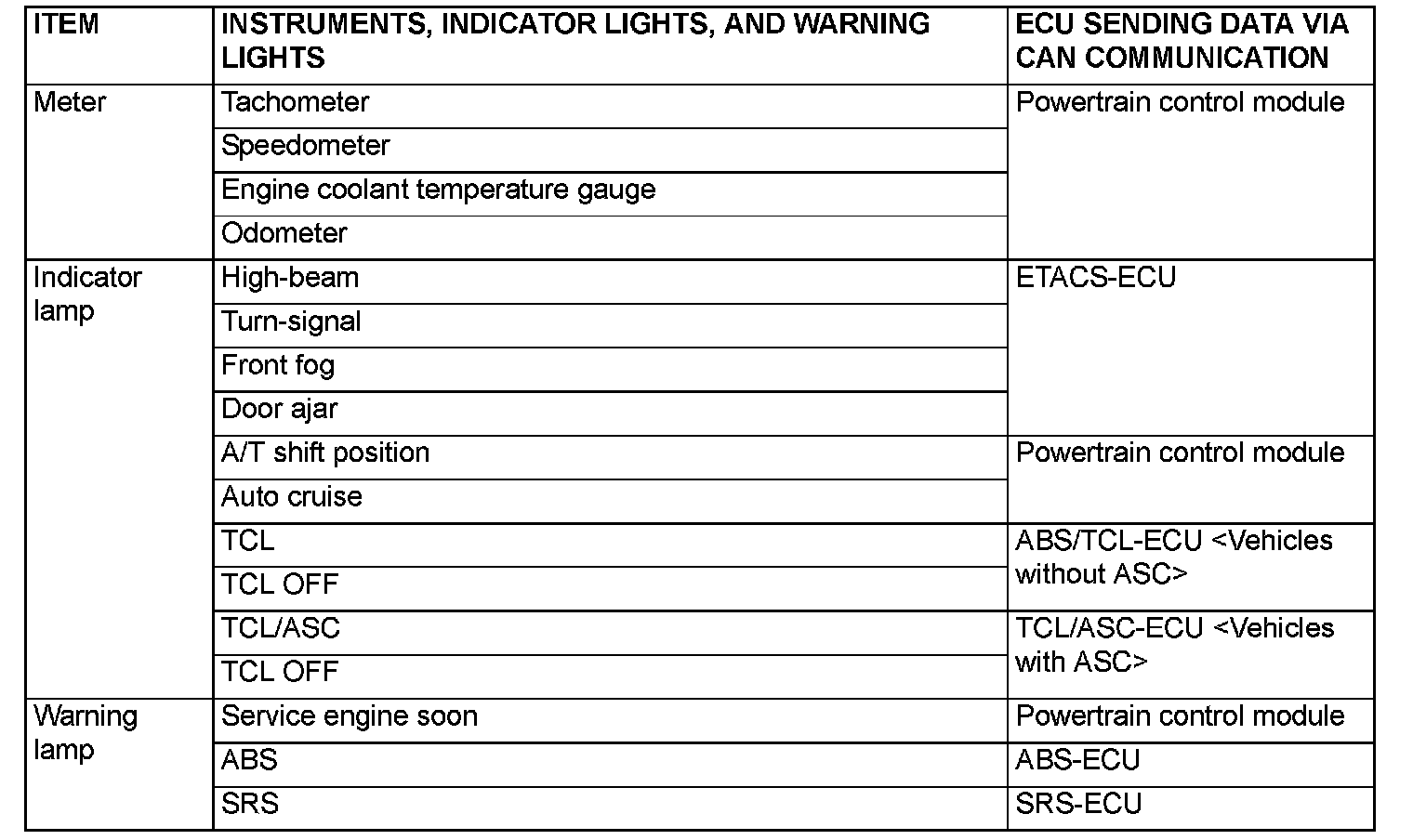 Some of the combination meter indications are based on information from ECUs via CAN bus communication. If there is any failure in the meters connected via the CAN bus communication, diagnose the CAN bus communication system. The given instruments, indicator lights and warning lights in the combination meter are controlled by ECUs via CAN bus communication.