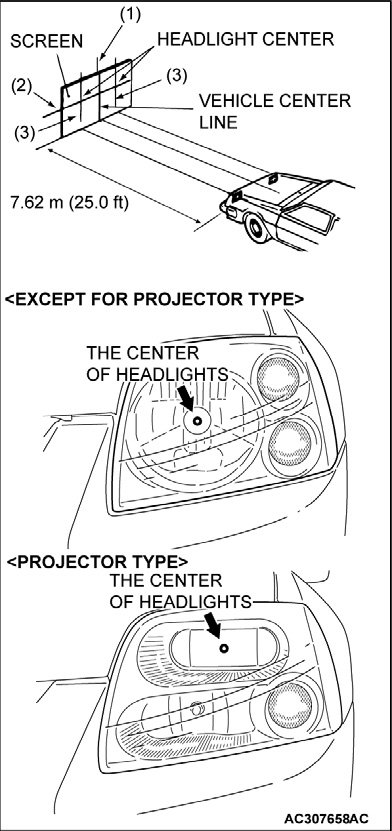 7. Place the vehicle on a level floor, perpendicular to a flat screen 7.62 m (25.0 feet) away from the bulb center-marks on the headlight lens.