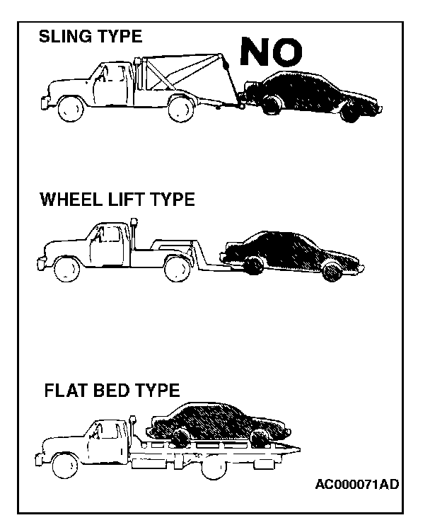 CAUTION: This vehicle cannot be towed by a wrecker using sling-type equipment; otherwise the bumper may become deformed. If this vehicle is towed, use wheel lift or flat bed equipment.