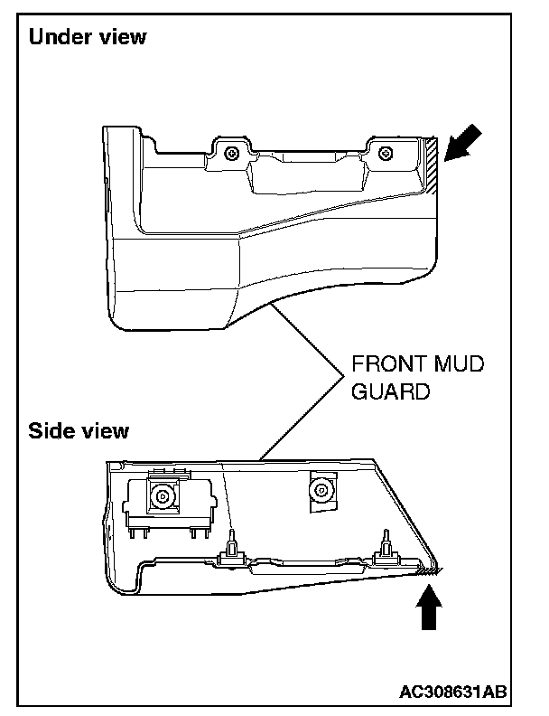 ^ If the assembling support area contacts with the front mud guard (arrow area as shown in the illustration), the front mud guard will be damaged. Slide the assembling support area to the front of the vehicle slightly to prevent the damage.