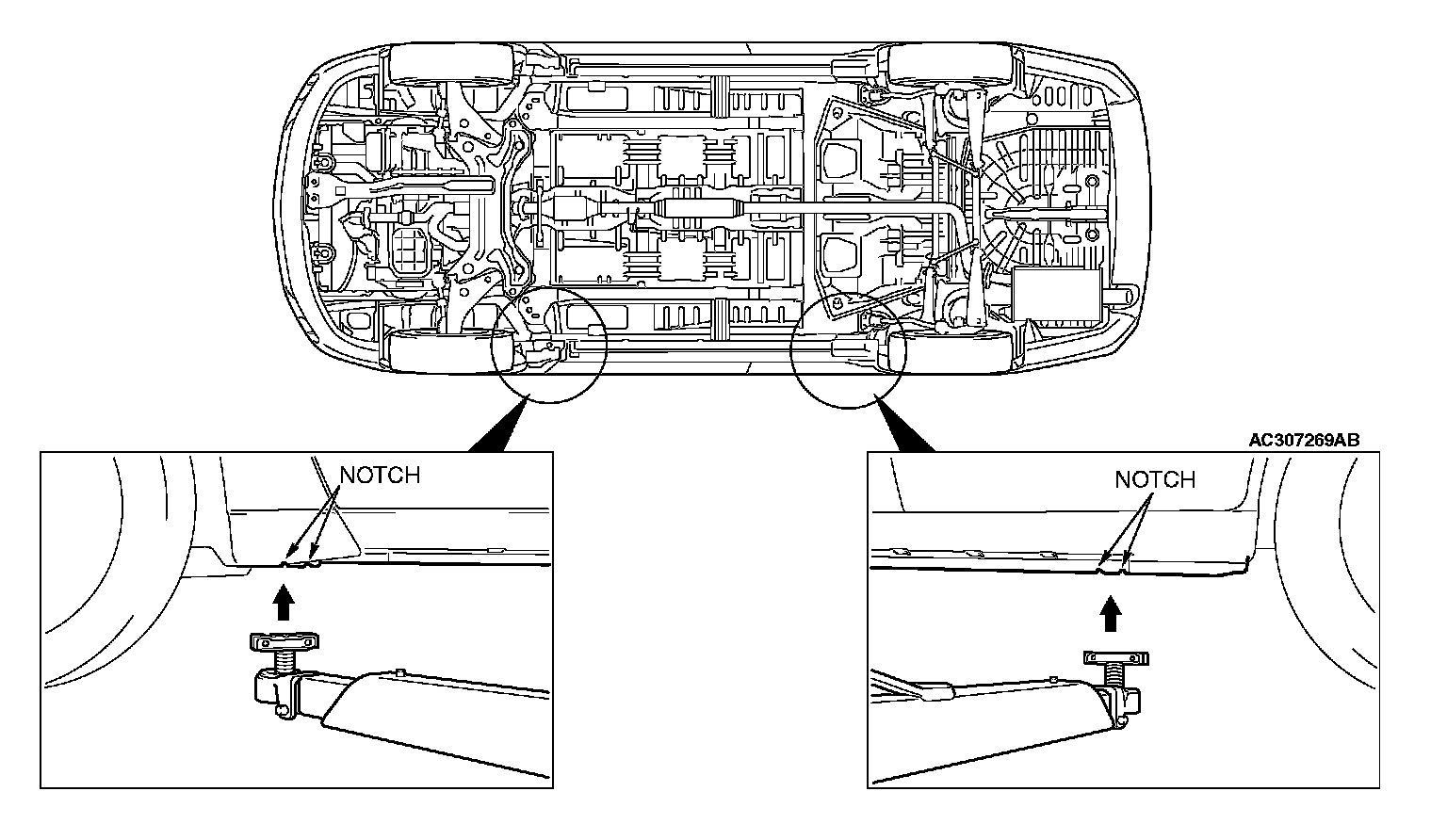 ^ For lifting, put rubber or similar material between the side sill and rigid rack, otherwise the side sill area will be damaged.