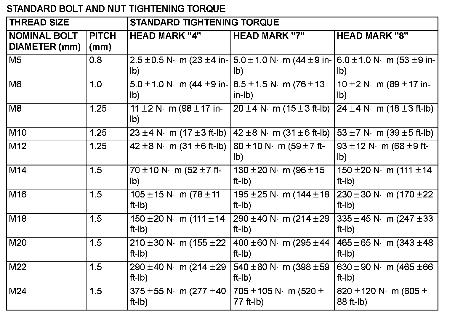 STANDARD BOLT AND NUT TIGHTENING TORQUE: