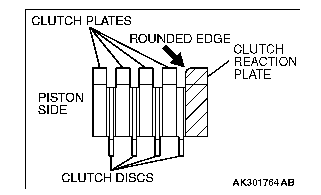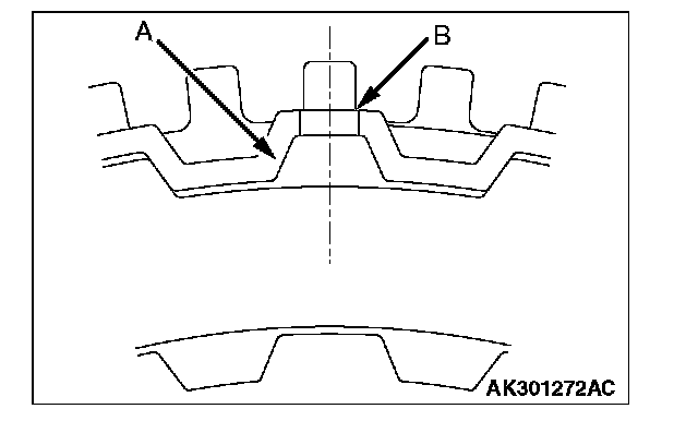 2. Install the clutch reaction plate in the direction shown. Install it the same as the clutch plates, so that the areas with no teeth (marked "A") are aligned with the retainer (marked "B"