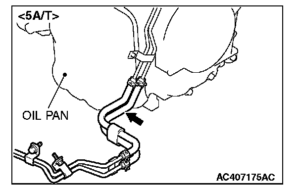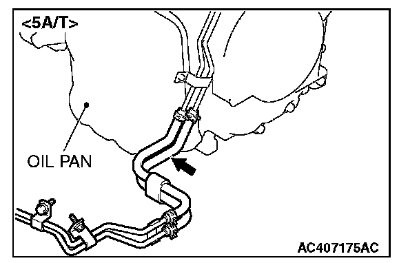 1. Disconnect the hose shown in the illustration which connects the transaxle and the oil cooler (inside the radiator). Place a container under the hose to collect the discharge.