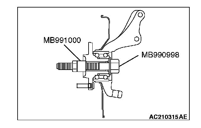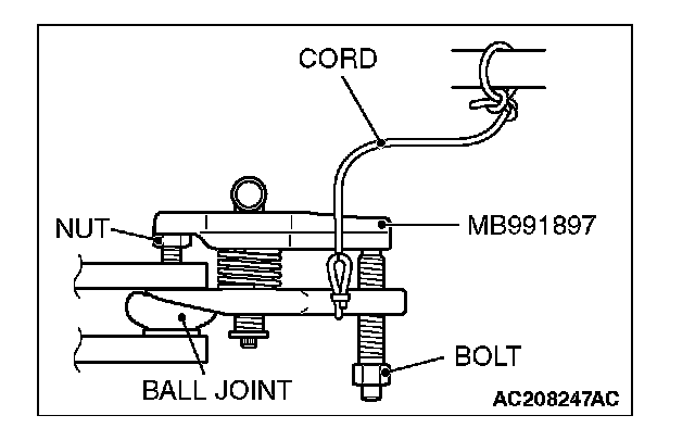 1. Replace the self locking nut with a regular nut, because the original one is a little bit large to install the special tool. Install special tool MB991897 as shown in the figure.