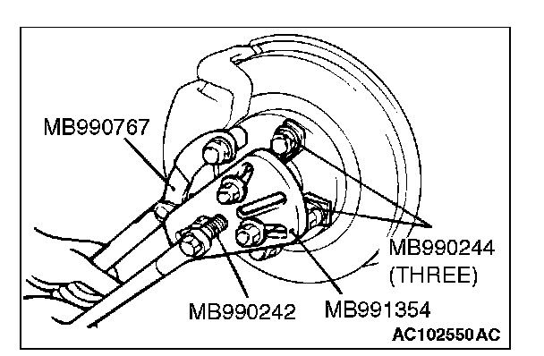 1. Use special tools MB990242, MB990244, MB991354 and MB990767 to push out the drive shaft or the drive shaft and inner shaft assembly from the hub.