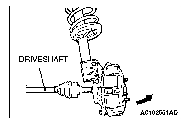 CAUTION: Do not apply pressure to the wheel bearing by the vehicle weight to avoid possible damage when the drive shaft is removed. If, however, vehicle weight must be applied to the bearing to move the vehicle, temporarily secure the wheel bearing by using special tools MB991000 and MB990998.