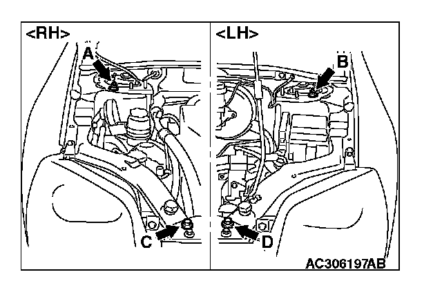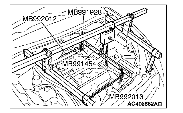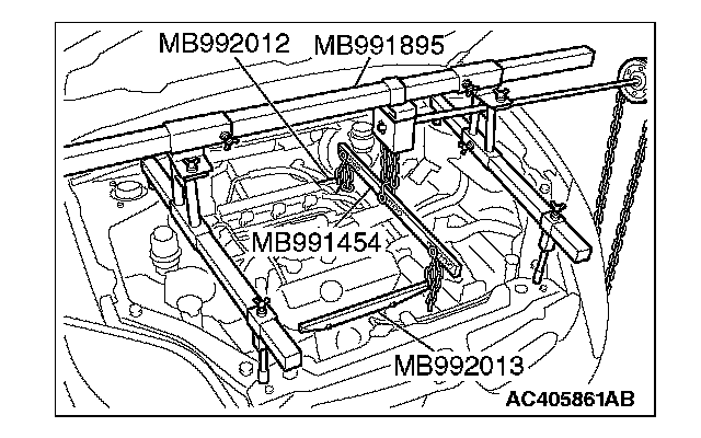 1. Set special tool MB991895 (engine hanger) to the front fender assembling bolts (A and B) and (C and D), which are located in the engine compartment, as shown.