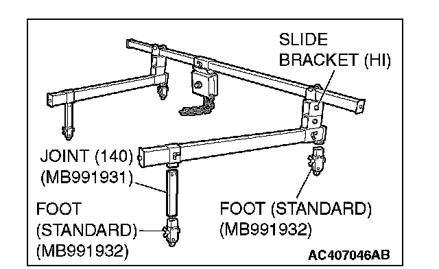1. Assemble the engine hanger (special tool MB991928). Set the following parts to the base hanger.