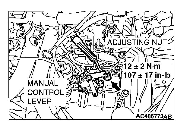 2. Place the cable stud into the manual control lever slot and install the nut loosely. Gently push the transaxle control cable into the manual control lever slot until the cable is taut. Tighten the nut to the specified torque.
