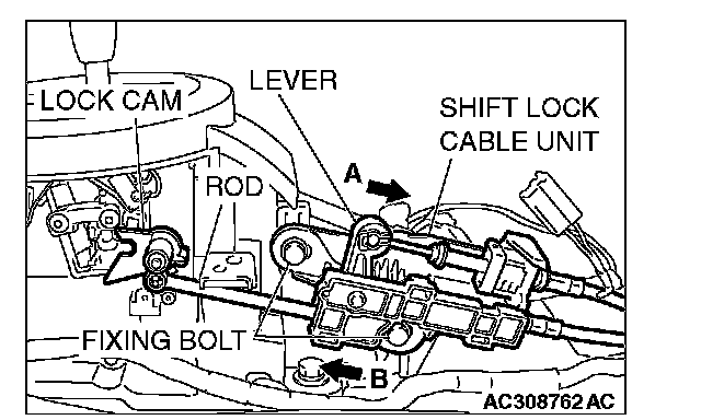 3. Install the rod of the shift lock cable unit to the lock cam, push the lever in direction A, push the shift lock cable unit in direction B and tighten the fixing bolt at the standard torque.