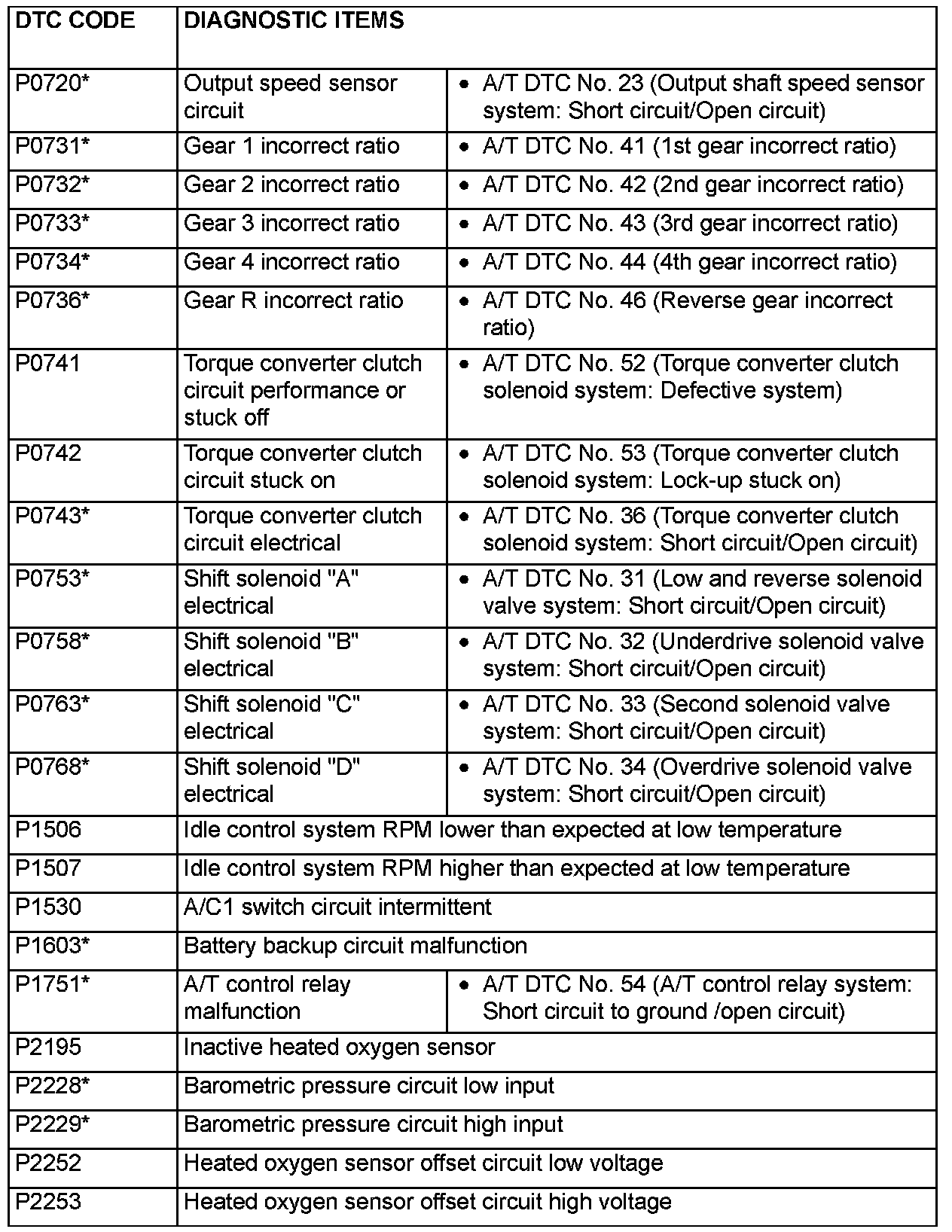 NOTE: After the ECM [M/T] or the PCM [A/T] detects a malfunction, a diagnostic trouble code is recorded he next time the engine is started and the same malfunction is re-detected. However, for items marked with a "*," the diagnostic trouble code is recorded on the first detection of the malfunction.