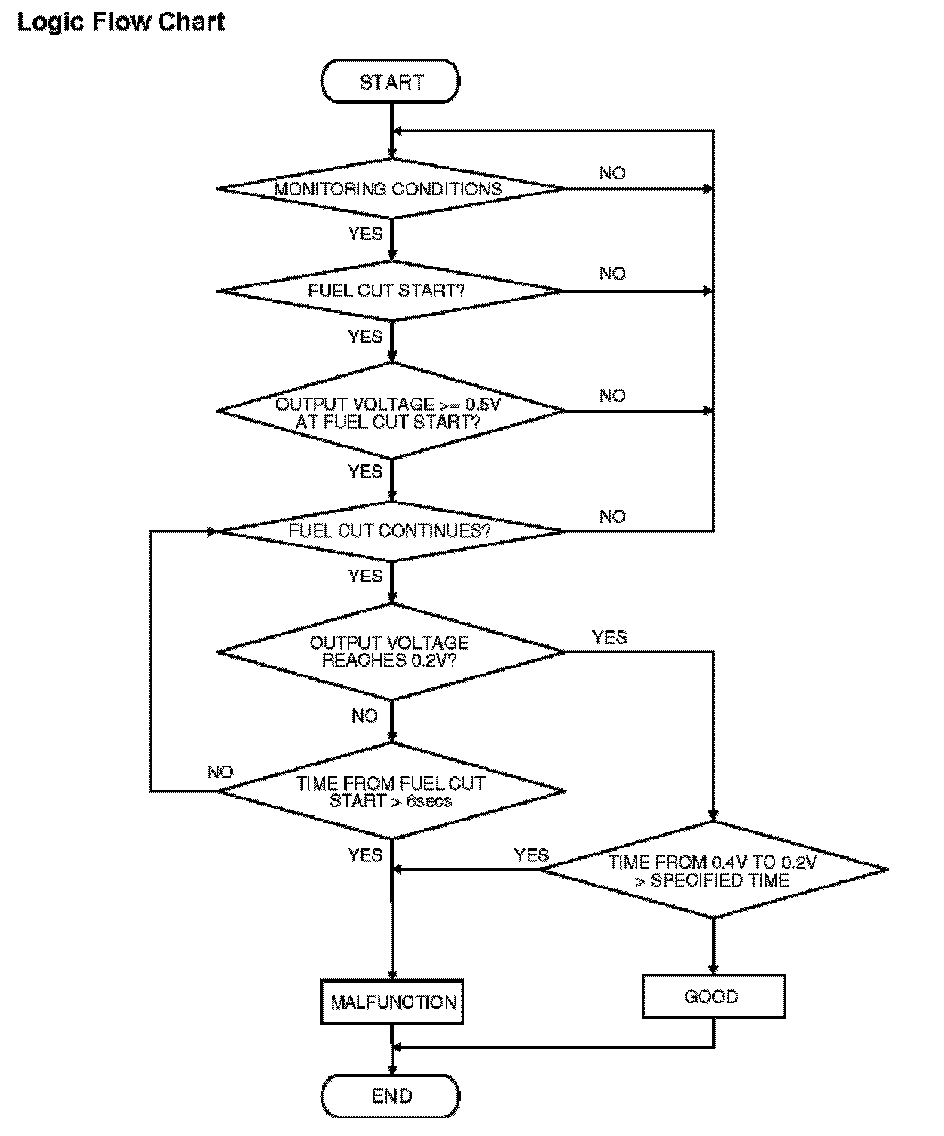 - Heated oxygen sensor (rear) output voltage does not reach 0.2 volt for specified time from 0.4 volt.