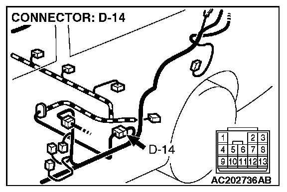 STEP 13. Check fuel tank differential pressure sensor connector D-09 and intermediate connector for D-14 for loose, corroded or damaged terminals, or terminals pushed back in the connector.