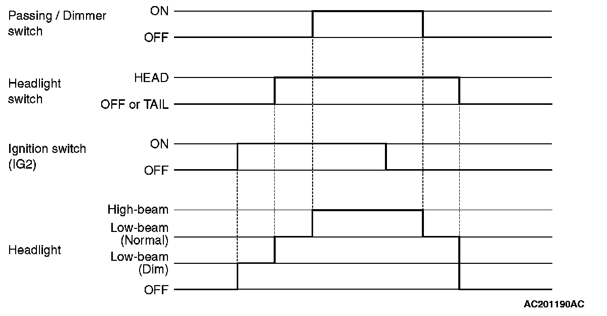 The column switch (column ECU) resets the dimmer switch and prevents the high beam from lighting up when turning on the headlight again if the headlight switch is put in the OFF position while the high beam of the headlight is on (including the instance when the dimmer switch is erroneously put in the ON state upon passing operations) and resets the dimmer switch