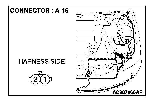 1. Disconnect front turn-signal light (LH) connector A-16 and measure the resistance available at the wiring harness side of the connector.