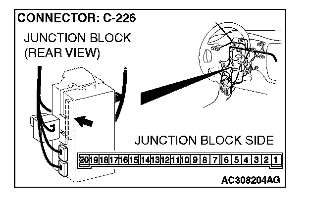 STEP 4. Check front turn-signal light (RH) connector A-20 and ETACS-ECU connector C-226 for loose, corroded or damaged terminals, or terminals pushed back in the connector.