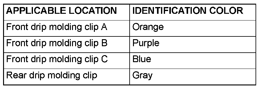 The front drip molding clips A, B, C and rear drip molding clip differ according to where they are used, so check the identification color before installation.
