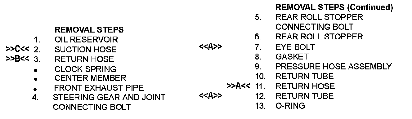 1. Loosen the crossmember mounting bolts and nuts, and lower the crossmember to a position so that the eye bolts or return tube at the steering gear side can be removed.