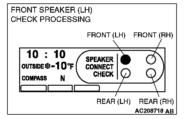 Operate the radio panel switches to test the speakers. The multi-center display (middle grade type) shows which speaker is sounding. Enter the speaker test mode according to the following steps: