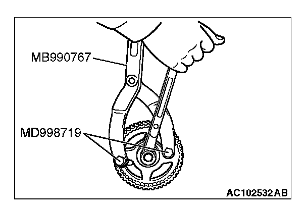 1. Hold the camshaft sprocket with special tools MB990767 and MD998719.