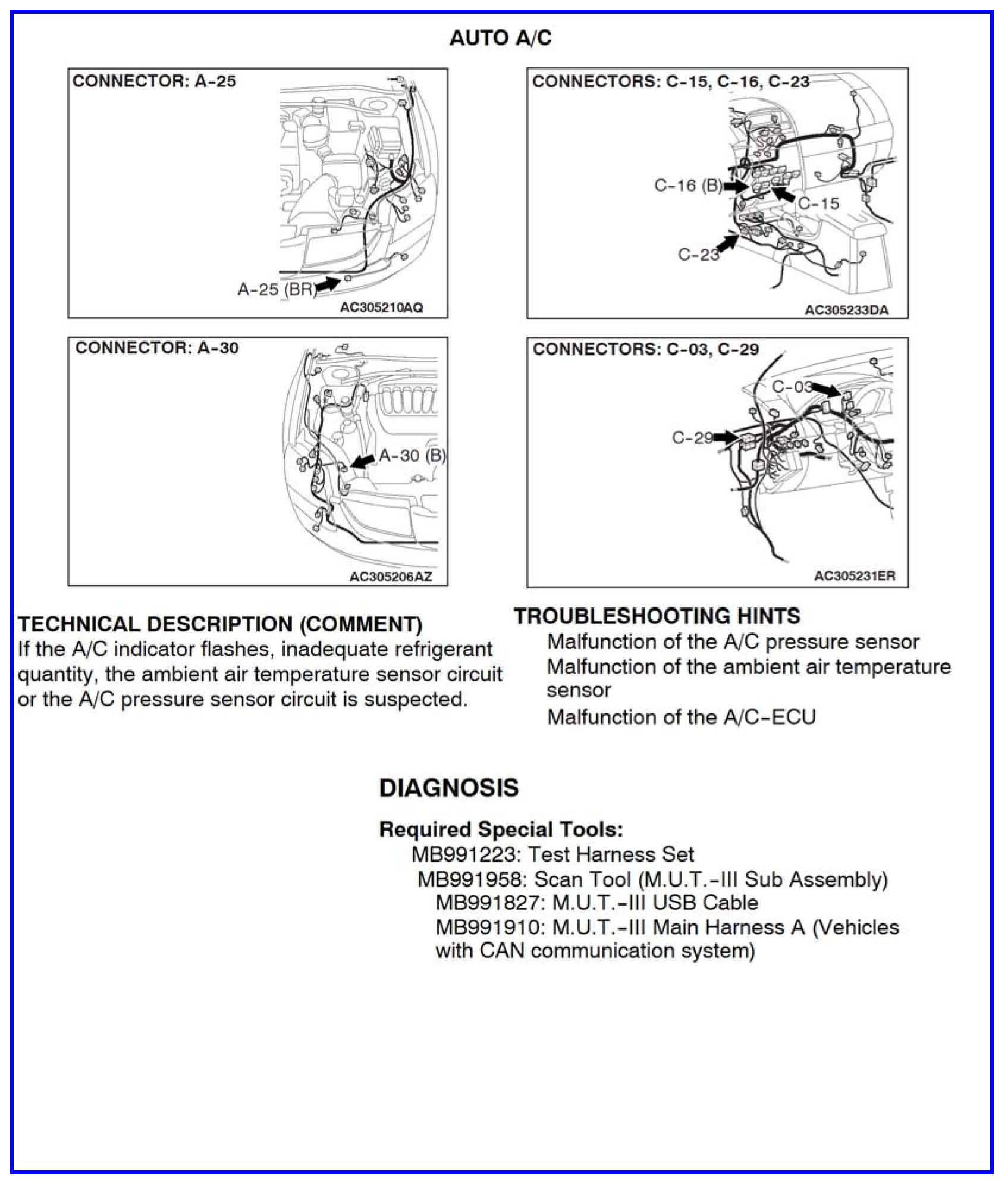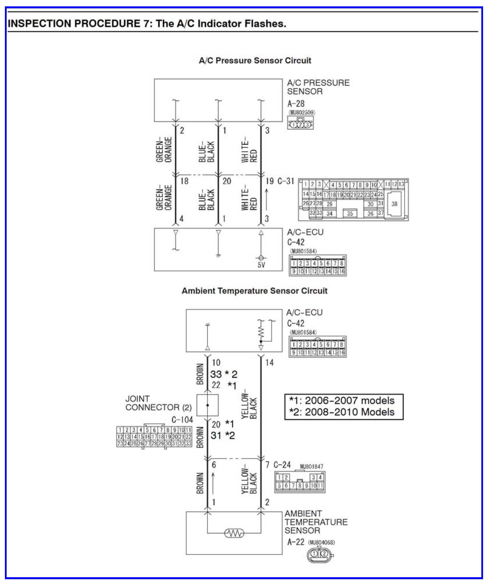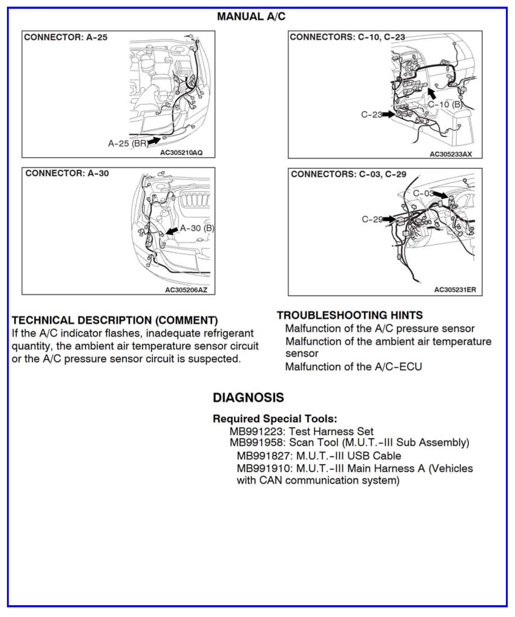 Inspection and troubleshooting procedures for A/C indicator light flashing are incomplete in the affected service manuals. This bulletin provides corrected inspection and troubleshooting procedures for flashing A/C indicator light for affected vehicles. The attached pages replace the existing service manual pages.