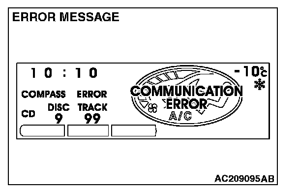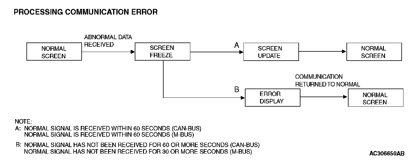The multi-center display unit (middle grade type) communicates with specific units via CAN and M bus lines. If an abnormality occurs (such as communication cancellation, interruption or out-of-range data), the screen will be frozen for some time. If a correct signal is received within specific period after that, the screen will be updated. If not, "COMMUNICATION ERROR" will be displayed on the screen. This screen indicates a failure in the multi-center display unit (middle grade type) itself, communication error with relevant units, components or sensor. In this case, you can pinpoint a trouble spot according to the CAN communication DTC code chart.