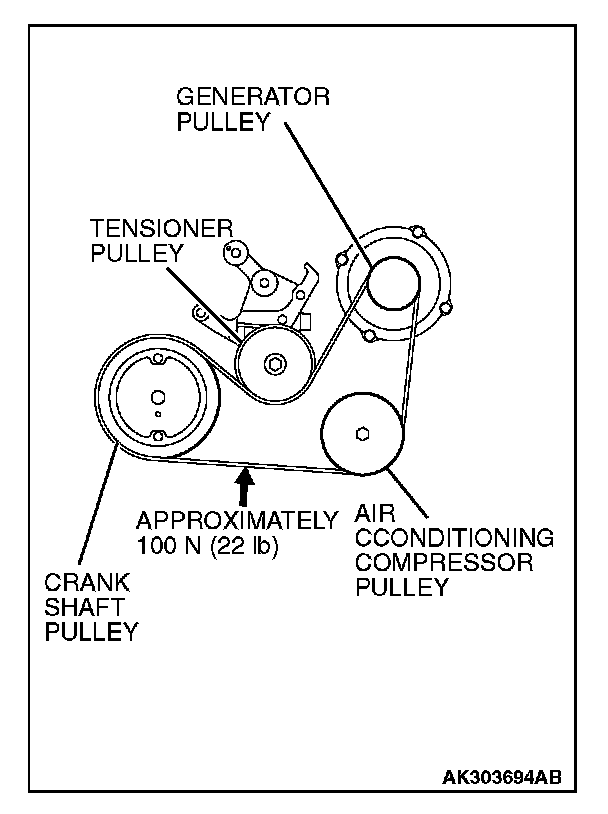 Apply approximately 100 N (22 pounds) of force to the middle of the drive belt between the pulleys (at the place indicated by the arrow) and check that the amount of deflection is within the standard value.