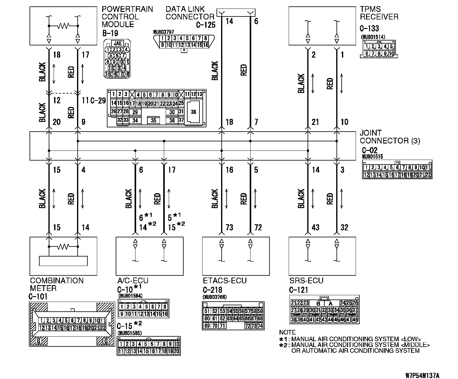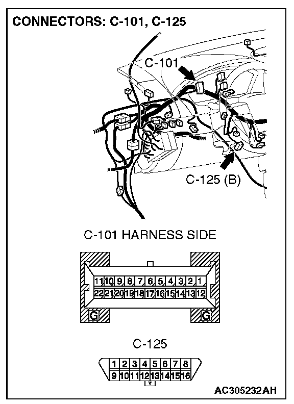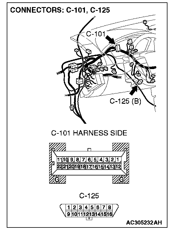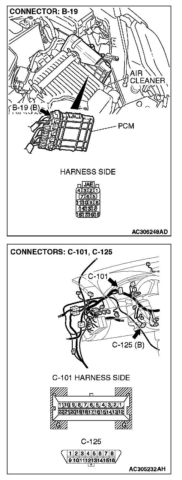 STEP 1. Check powertrain control module connector B-19, combination meter connector C-101 and data link connector C-125 for loose, corroded or damaged terminals, or terminals pushed back in the connector.