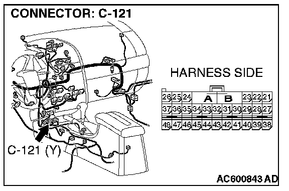STEP 16. Check SRS-ECU connector C-121 for loose, corroded or damaged terminals, or terminals pushed back in the connector.