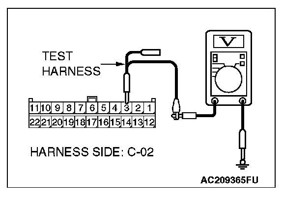 1. Disconnect joint connector (3) C-02, and measure the voltage at the wiring harness side of joint connector (3) C-02.