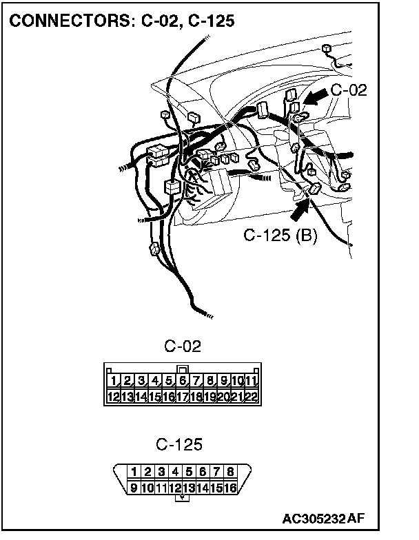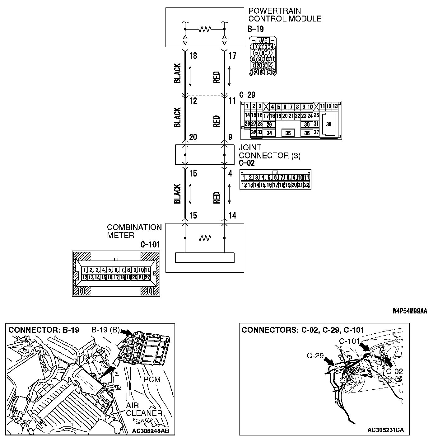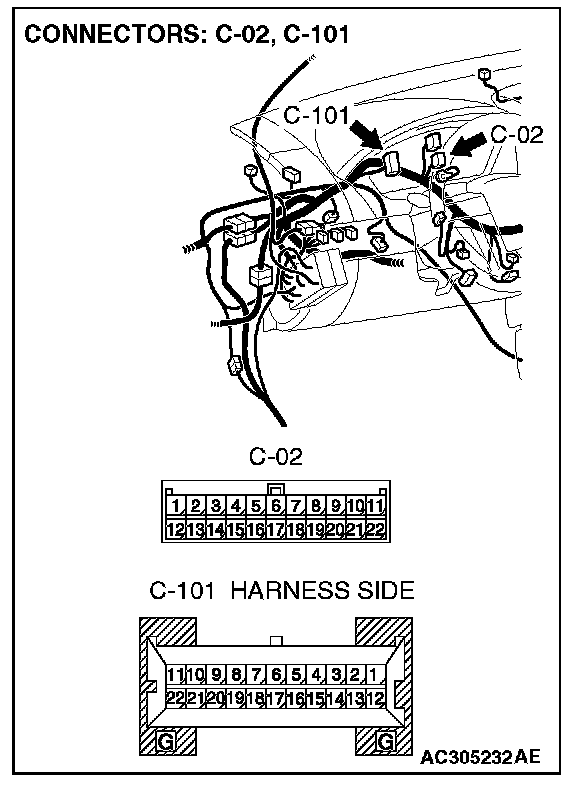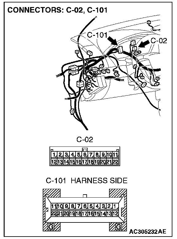 STEP 3. Check joint connector (3) C-02 and combination meter connector C-101 for loose, corroded or damaged terminals, or terminals pushed back in the connector.
