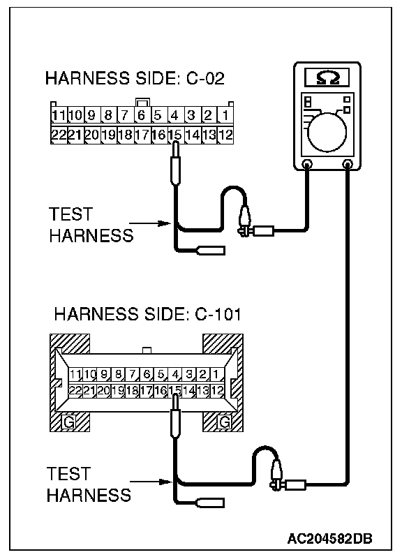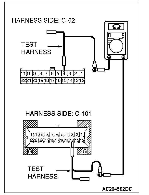 1. Disconnect joint connector (3) C-02 and combination meter connector C-101, and measure the resistance between each wiring harness side connector.