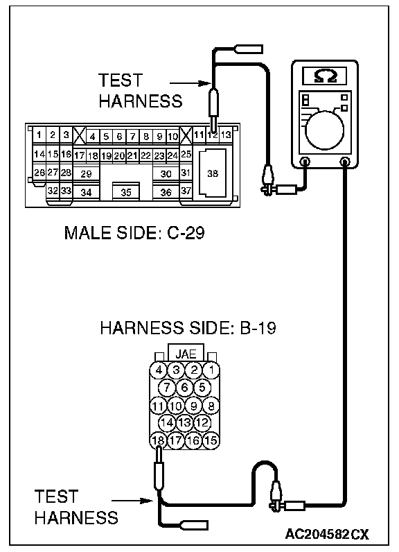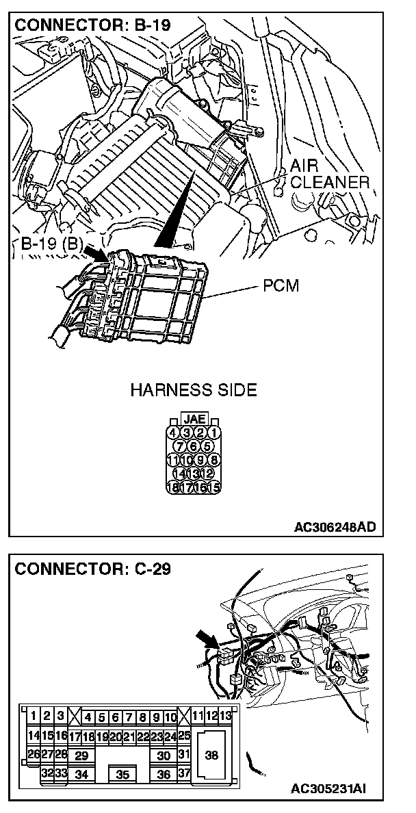 1. Disconnect intermediate connector C-29 and powertrain control module connector B-19, and measure the resistance between the wiring harness side connector of powertrain control module connector B-19 and the male side connector of intermediate connector C-29 (at front wiring harness side).