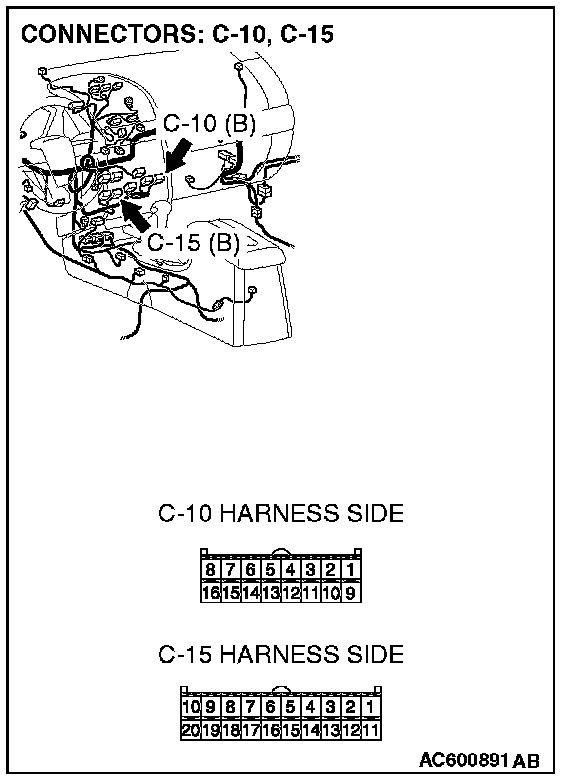1. Disconnect A/C-ECU connector C-10 [manual air conditioning system (low)] or C-15 [manual air conditioning system (middle) or automatic air conditioning system].