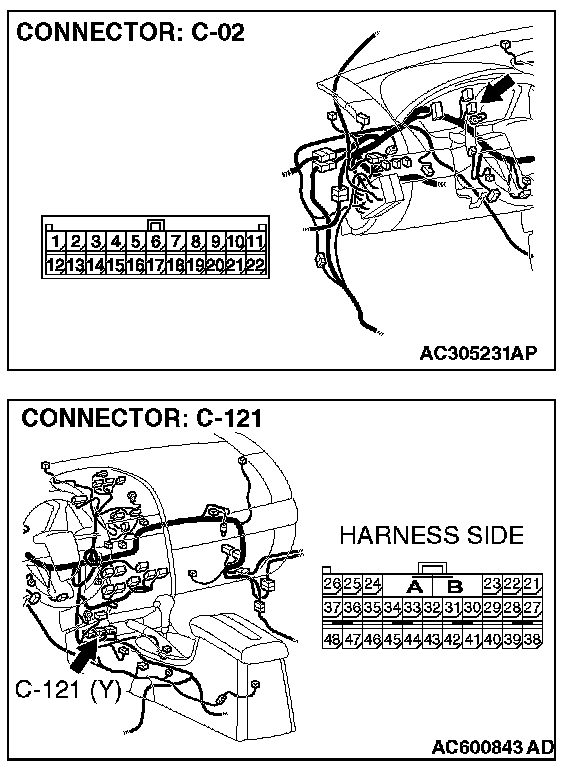 1. Disconnect joint connector (3) C-02 and SRS-ECU connector C-121, and measure the resistances at the wiring harness sides of joint connector (3) C-02 and SRS-ECU connector C-121.
