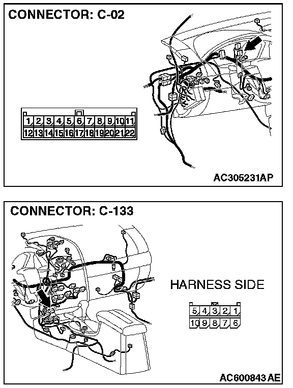 1. Disconnect joint connector (3) C-02 and A/C-ECU connector C-10 [manual air conditioning system (low)] or C-15 [manual air conditioning system (middle) or automatic air conditioning system], and measure the resistances at the wiring harness sides of joint connector (3) C-02 and A/C-ECU connector C-10 [manual air conditioning system (low)] or C-15 [manual air conditioning system (middle) or automatic air conditioning system].